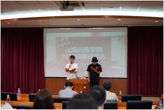 报告厅门口矗立的典礼会标“上海乐鱼网页版页面登录2018级毕业典礼”在淡蓝色背景衬托下,显得典雅庄重;橙色的毕业口号“自由、激情、致青春”像星星般点缀在会标下,伴着仙人掌花瓣,闪闪发光,让会标显得活泼可爱,如同毕业生们正蓬勃向上、灿烂燃烧的青春。2019级学生卢楚韬、阚晨主持典礼。